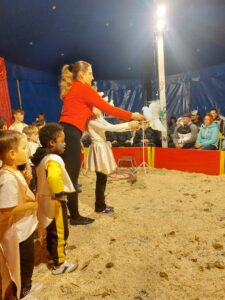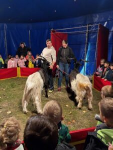 … war das Motto in unserer Kita in der Woche vom 13.10. – 17.10.2025. Die Kinder staunten nicht schlecht, als sie am Montag ein richtiges Zirkuszelt auf unserem Spielplatz entdeckten und nicht nur das: begrüßt wurden die Kinder und Eltern jeden Morgen bereits am Eingang von schnatternden Enten. Auf dem Spielplatz konnten die Kinder zu den Enten auch noch Tauben, Frettchen und Ziegen bestaunen. Eine Woche lang hieß es, jeden Tag proben, proben, proben. Am Ende der Woche wartete dann auf alle Eltern die große Aufführung im Zirkus Benjamin. Alle Kinder konnten nun endlich ihren Eltern zeigen, was sie die ganze Woche lang einstudiert haben. Mit glanzvollen Kostümen, viel Aufregung und voller Vorfreude betraten die kleinen großen Künstler nun die große Manege und wurden vom Publikum gefeiert. Es war für uns alle eine aufregende Woche mit vielen schönen Momenten. Die Kinder zeigten Mut, haben viel Spaß und wuchsen über sich hinaus.